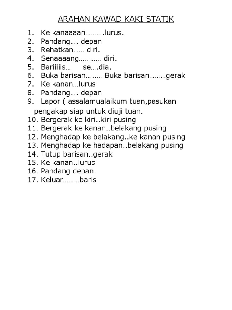 Buku Panduan Kawad Krs from online.fliphtml5.com Share & embed arahan kawad kaki asas please copy and paste this embed script to where you want to embed Aspek penting dalam kawad kaki adalah sentiasa mendengar arahan. Dec 26, 2009 · arahan asas kawad kaki asas kawad kaki pergerakan 1. Teratai teratai nama kami, bekerja setiap hari. Kata arahan kawad december 2019 66. More images for arahan kawad kaki asas » Rph kawad kaki may 2020 10. Baris sedia melapor tabik hormat.
